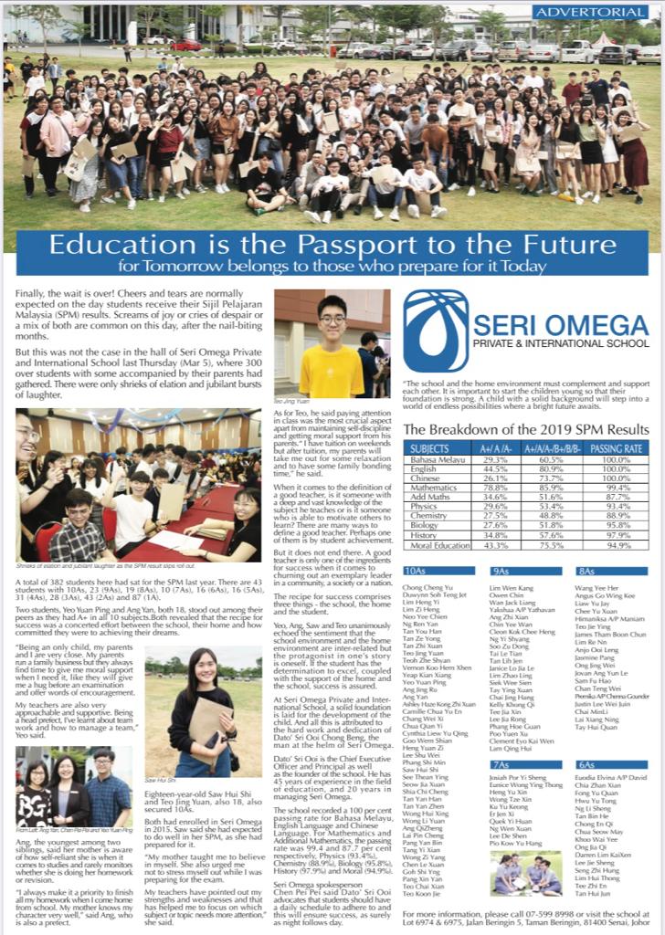 The school recorded a 100 per cent passing rate for Bahasa Melayu, English Language and Chinese Language. For Mathematics and Additional Mathematics, the passing rate was 99.4 and 87.7 per cent respectively, Physics 93.4%, Chemistry (88.9%), Biology (95.8%) , History (97.9%) and Moral (94.9%).