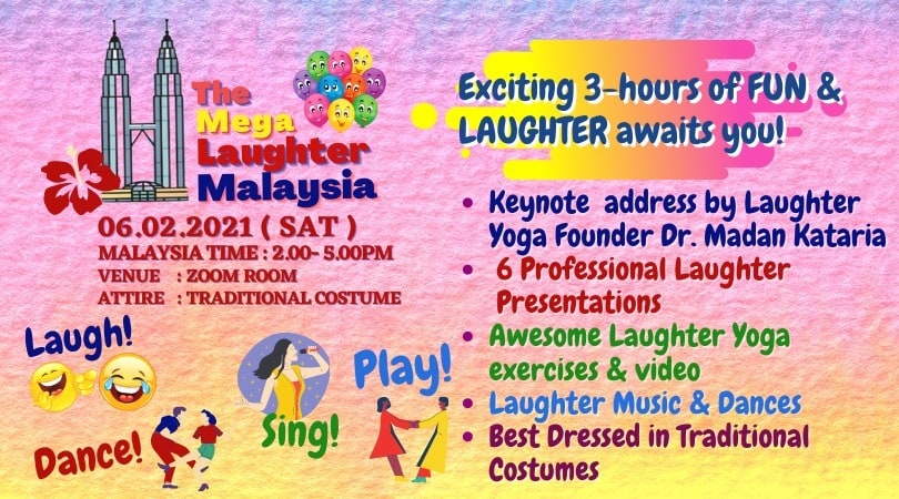 Meanwhile 7 Laughter Yogis will also be present to lead and share their Laughter Exercises. They are Kara Sherman (USA), Keyem Thomez (Bahrain), Sara Mei Woo (Singapore), Bachan Singh (Malaysia), Lina Lim Lee Mui (Malaysia), Raja Perumal Raja (Malaysia) and Siem Lee (Malaysia).
