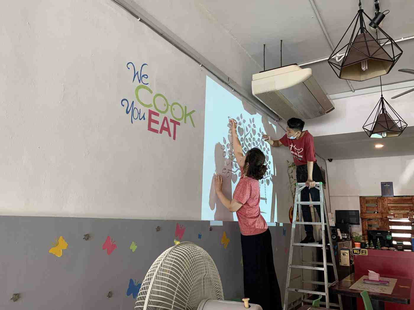 That’s the lady boss. Not only can she cook but she paints as well. She is seen here decorating the wall of Choi’s Don & Dak with the help of an employee.