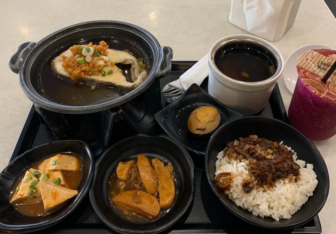 The fried soybean cod fish set costs RM23.90. The rice is topped with pork and there’s egg, tofu, potatoes and a bowl of soup to complement the cod fish. The Dragon Fruit juice is RM7.90.